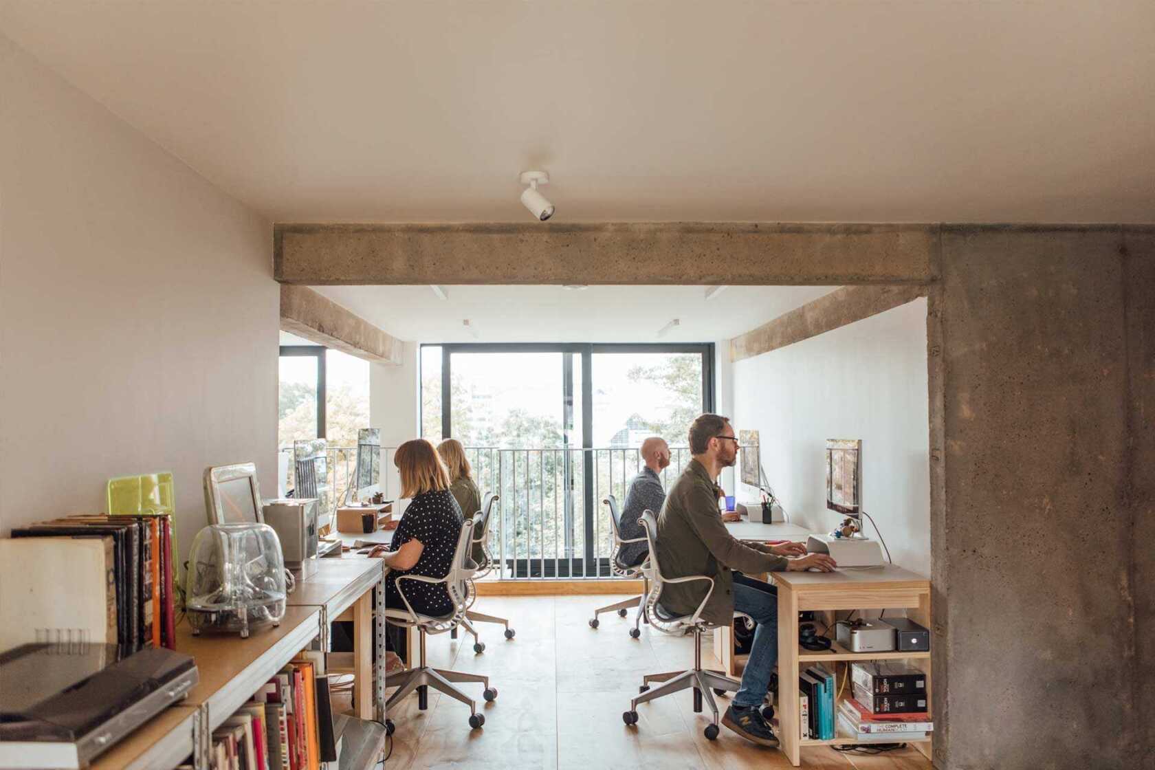 The concrete structure also appealed - it leaves a blank, adaptable canvas - ideal for us to trial exhibition displays and moving images without being impacted by noisy interiors. It’s flexible, open and spacious, exactly what we need. We purposely chose long lasting materials to compliment the original features, with sustainability and usability at the heart of our decisions. We didn’t want to over complicate the space, it's important that our team have the freedom to bring their personalities into the space, we encourage trinkets and books that reflect who they are - it’s all part of the eclectic mix that makes us us!